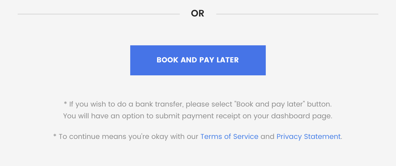 After clicking on the ‘Book and pay later’ button, customer will be able to see the transaction in the backend. There’re two buttons, Submit Payment Receipt and Make An Online Payment.