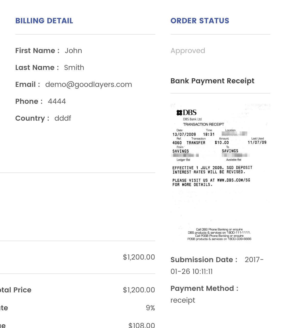 This button allows customers to submit payment receipt after they proceed the bank transfer.